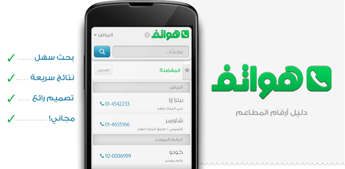 تطبيق هواتف هو تطبيق مجاني للبحث عن رقم أي مطعم في المملكة ( دليل مفتوح للجميع ) يوفر للناس الحصول على أرقام المطاعم التي يبحثون عنها بكل سهولة ويسر، ويتيح لهم إضافة أرقام جديدة إلى التطبيق ليستفيد منها الجميع مميزات التطبيق:
